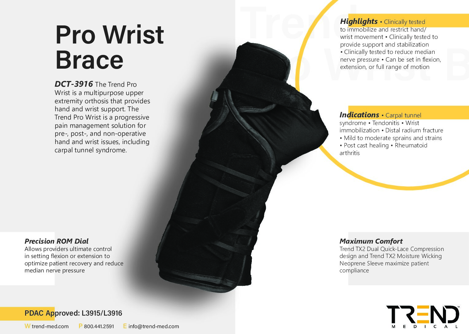 The Trend Pro Wrist is a multipurpose upper extremity orthosis that provides hand and wrist support. The Trend Pro Wrist is a progressive pain management solution for post- and non-operative hand and wrist issues, including carpal tunnel syndrome. A precision range of motion dial allows providers ultimate control in setting flexion or extension to optimize patient recovery and reduce median nerve pressure.