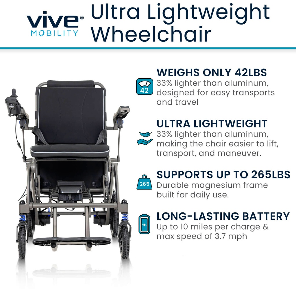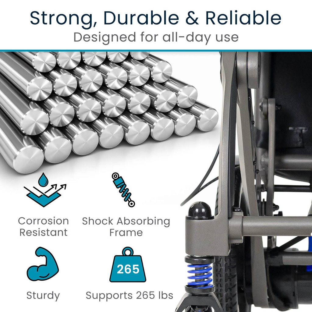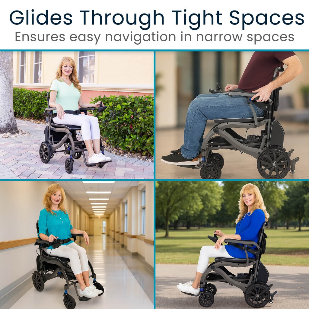 Weighing just 42Â lbs, the Air Frame Power Wheelchair is easy to lift, fold, and store: perfect for travel, quick errands, or daily use. The intuitive joystick control and smooth-driving design make it simple to navigate tight indoor spaces and busy environments with confidence. A long-lasting battery provides extended range and consistent performance, so you can go about your day without worrying about recharging. Designed for comfort and support, the padded seat and backrest offer a plush feel ideal for all-day use, supporting up to 265 lbs. With its sleek, modern build and user-friendly features, this power chair delivers both convenience and dependable mobility.Â
