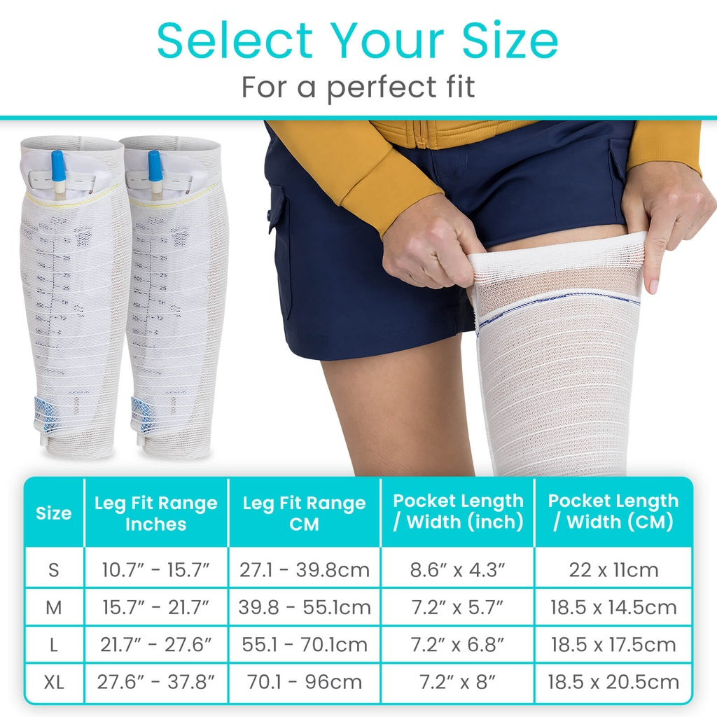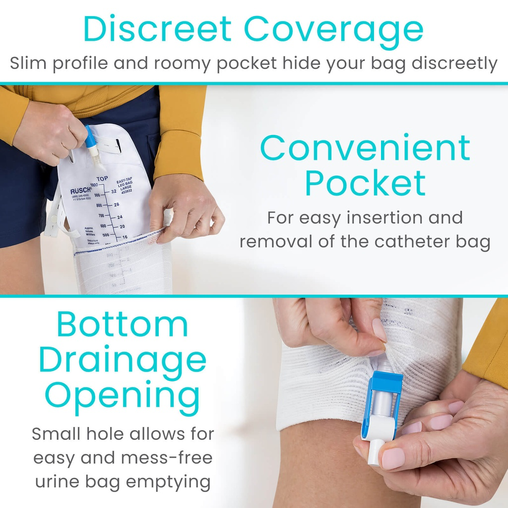 The low-profile construction allows the sleeve to be worn discreetly under clothing, offering a dignified solution for securely managing catheter leg bags during movement and daily routines.