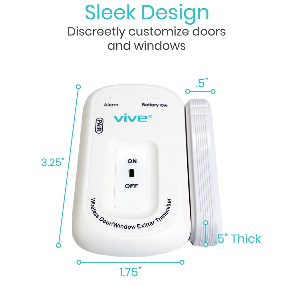 Remotely monitor loved ones and patients with the Vive wireless door alarm to minimize the dangerous wandering incidents common for those with Alzheimer’s or dementia. The versatile alarm can be used with any door or window for simple, remote monitoring with a range of 150 feet. Easily connects to the Vive wireless pager (pager sold separately)