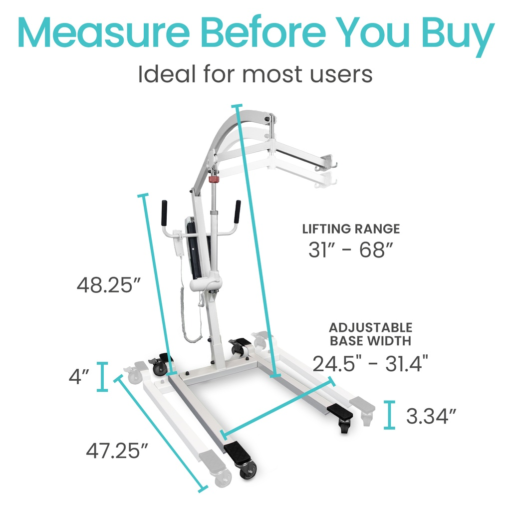 Customize your patient lift effortlessly with the adjustable base, with no bending or straining required. The sturdy steel frame supports up to 400 pounds, while the lift actuator reaches heights from 31” to 68”. Count on reliable support that enhances mobility in any room.
