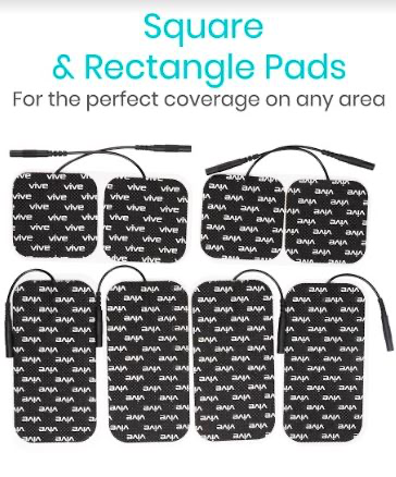 Self-Adhesive, Pre-Gelled Electrodes Suitable for use on the neck, shoulders, arms, abdomen, back, hip, leg and foot, the Vive EMS TENS unit includes four square and four rectangle electrodes with lead wires. The reusable electrode pads are pre-gelled and self-adhesive for easy placement and removal.