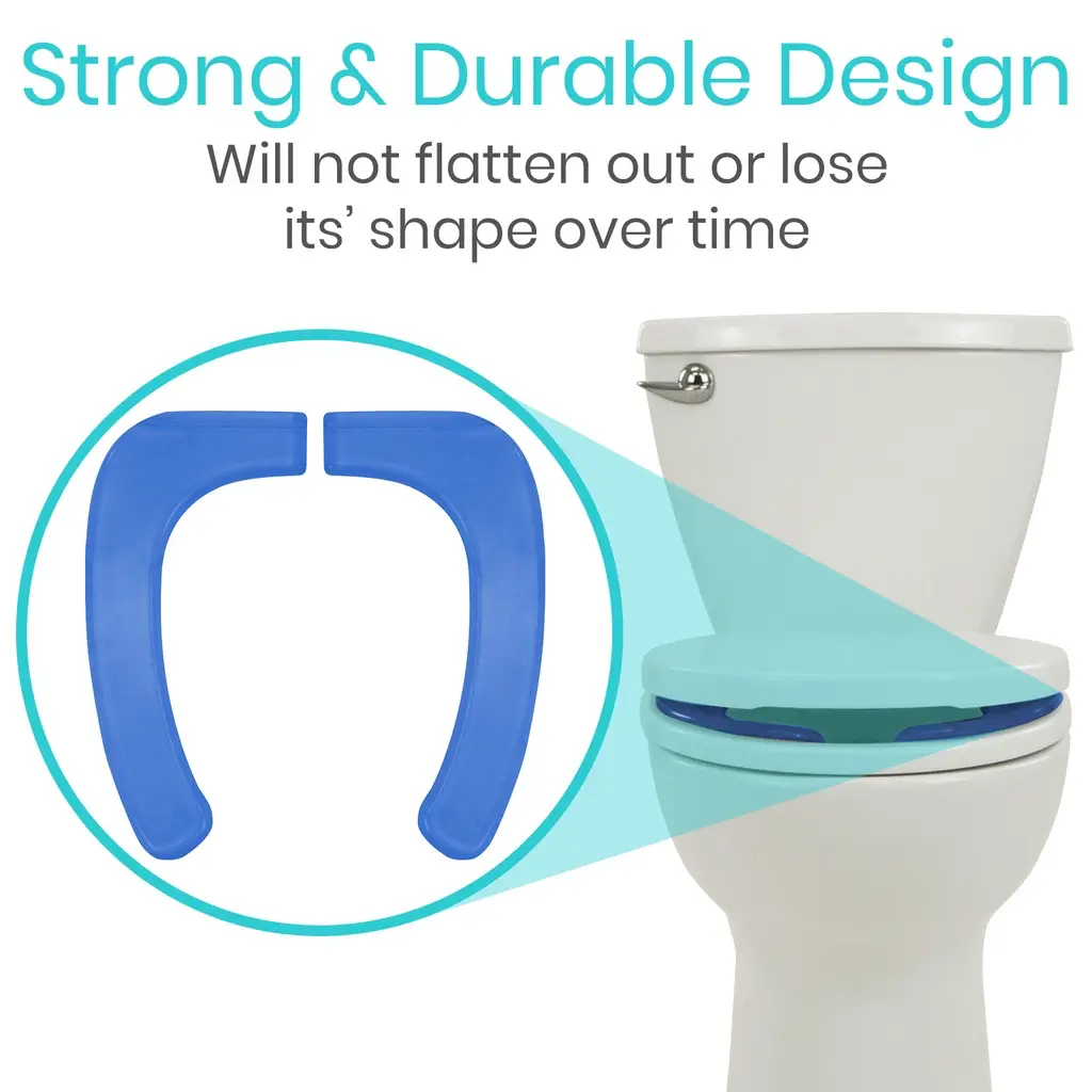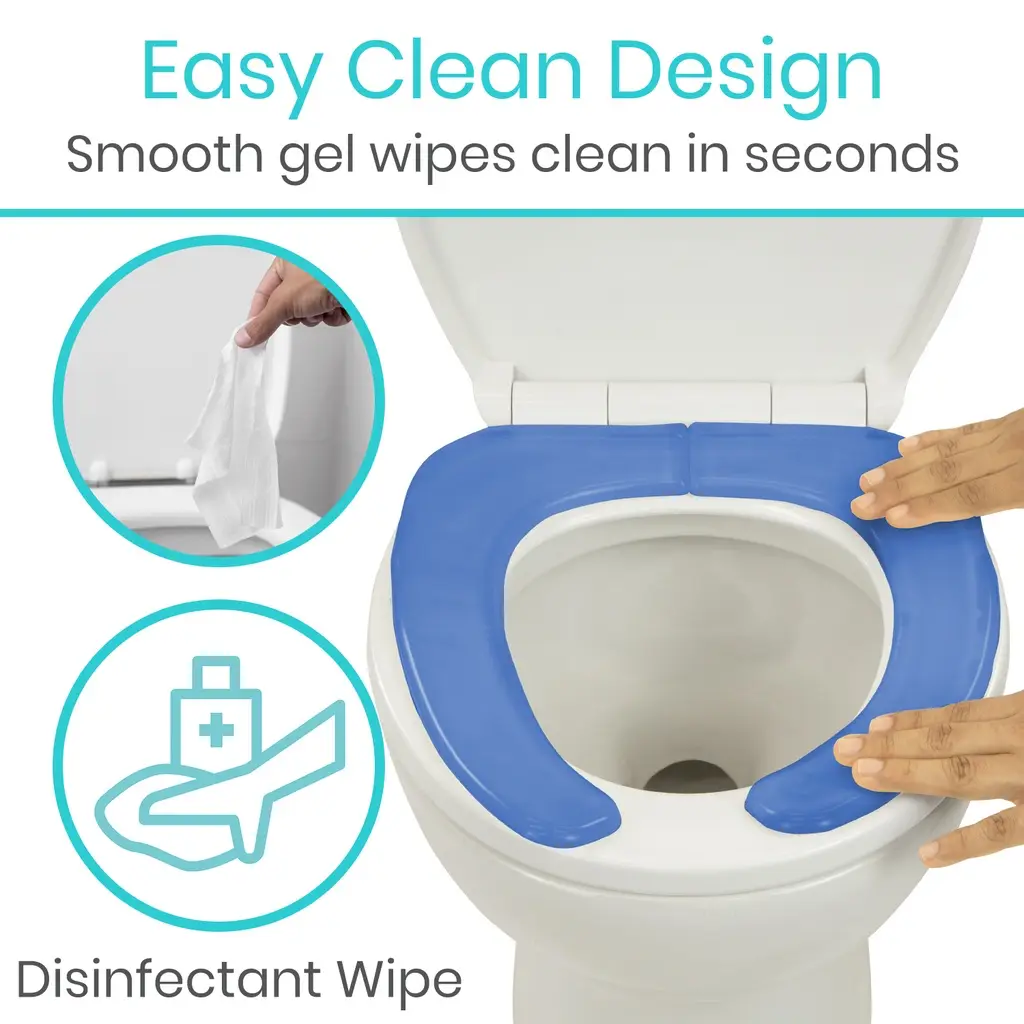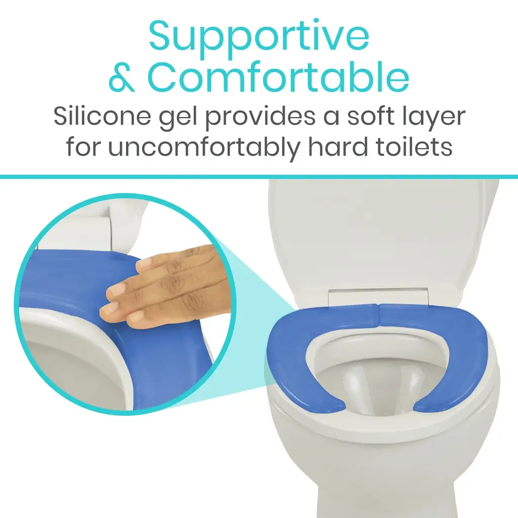 Providing a soft layer for uncomfortably hard toilet seats, the gel toilet seat pad relieves painful pressure points and general discomfort. The seat cushion is made with a soft silicone gel that will not flatten out or lose its’ shape.