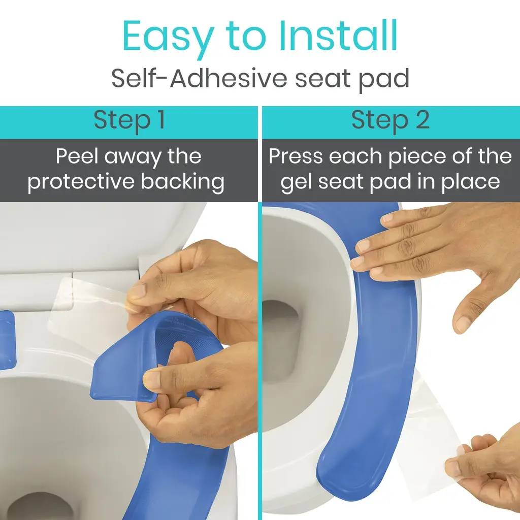 Easy to install, the two-piece Vive Gel Toilet Seat Cushion is self-adhesive. Simply peel away the protective backing and press each piece of the gel seat pad in place.