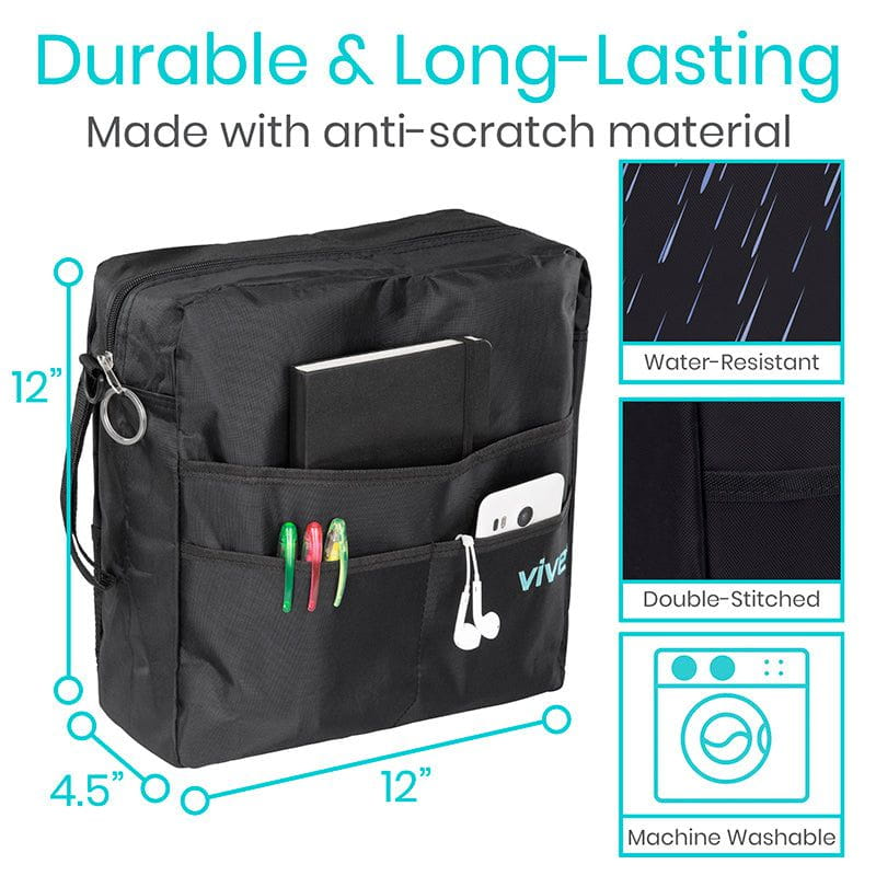 Quickly and easily secure the durable rollator bag on any style rollator, walker, wheelchair or transport chair with two adjustable Velcro straps. A padded shoulder strap is also included as a convenient alternative for caregivers or loved ones. The large rollator bag measures 12” wide by 12” high by 4.5” deep.