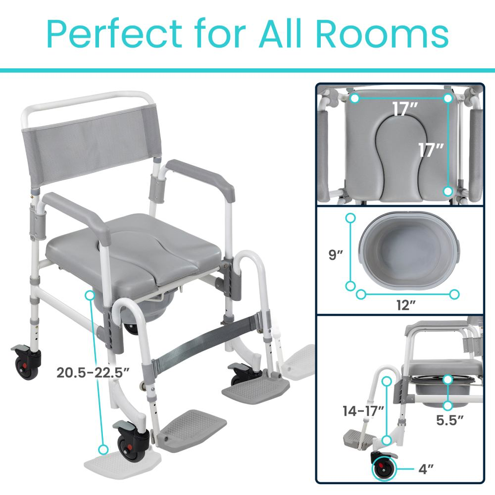 Experience unparalleled versatility with the Shower Commode Transport Chair. This product combines the functionality of a shower chair, commode, and transport chair into one compact solution. With sturdy locking wheels, this chair provides smooth transportation across various surfaces and locks securely in place to prevent unwanted movement, offering stability and peace of mind.