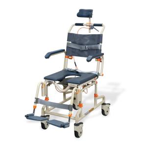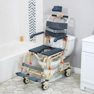 The Roll-inBuddy with Tilt (SB3T) rolling shower chair is designed for use in curb-less or accessible roll-in shower stalls. It measures 22” at its widest point (armrest), allowing it to fit through narrow doorways. The SB3T offers a 30-degree infinite tilt feature for pressure relief, increased comfort, and easy bathing. This versatile chair smoothly rolls over most toilets and can double as a bedside commode. The SB3T chair comes equipped with a standard front- opening cushion, neck rest, swing-away and removable footrests, flip-back, lockable and removable armrests, 5″ lockable casters, a removable commode bucket with lid, lap belt, chest belt and height adjustability. Please note that the Roll-inBuddy with Tilt (SB3T) is a caregiver- assisted product; it is not intended for independent use.